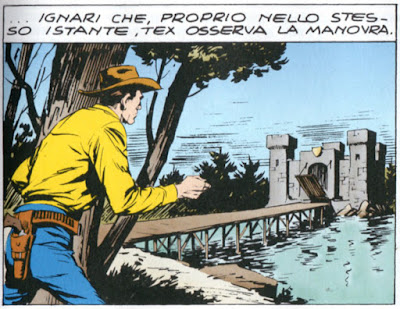 La seconda immagine arriva poco dopo, e la troviamo nell'ultima pagina del Classic. Tex scruta da lontano il castello del Grande Re, l'avversario di questa lunga avventura. Come recita la didascalia sono ormai passate due ore dalle vignette precedenti e siamo prossimi alla notte, momento in cui Tex penetrerà nella fortezza.